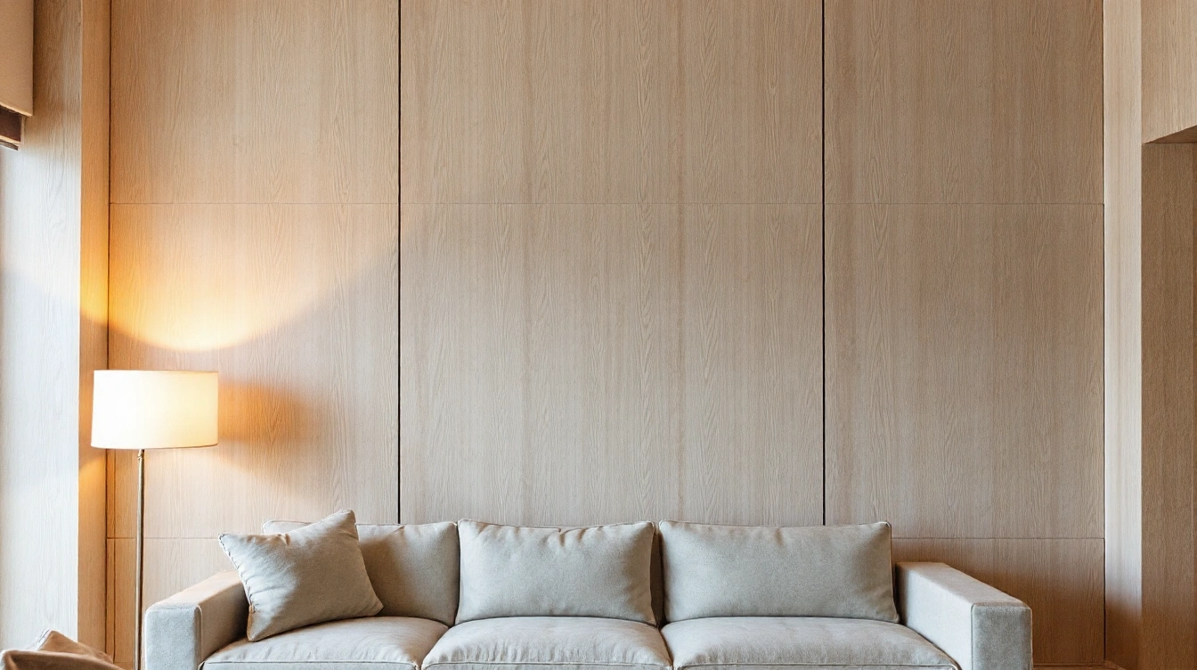 Pour vous inspirer, imaginez un mur en lambris peuplier clair, ponctué de cadres métalliques verts ou noirs, accompagné d’un tapis en laine tressée aux teintes naturelles. Ou encore une pièce où le lambris s’étend jusqu’au plafond, contrasté par un canapé en velours sombre et une table basse en pierre brute. Ces combinaisons soulignent la richesse du bois et offrent un rendu élégant sans surcharge visuelle.